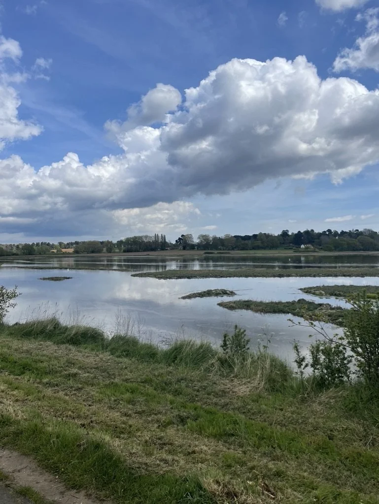 Alt text: The Deben river from a grass and dirt path; houses and trees in the far distance below a cloudy bright sky.